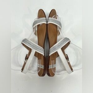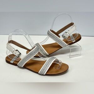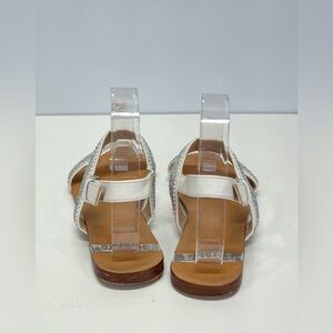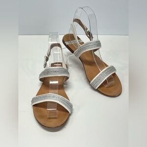 These Bershka sandals feature a minimalist design with white straps with silver bead accent, perfect for casual outings. The open-toe style and ankle strap with buckle closure ensure a comfortable fit. Enjoy the elegance and simplicity of these flat sandals for any occasion.