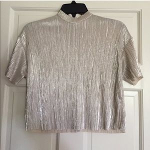 Light weight crinkle material. Has a high neck style. Fits cropped. Great for the holidays with a skirt or high waisted pants.