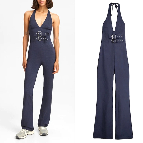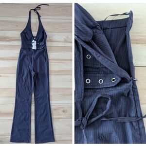 Bershka pinstripe Y2k halterneck jumpsuit buckle