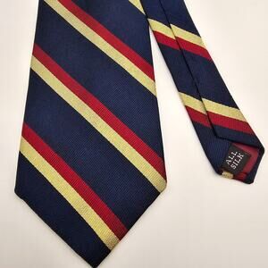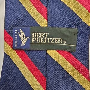Elevate your style with this classic Bert Pulitzer repp striped tie. Made in the USA from luxurious silk, this tie features a timeless design in red, yellow, and navy. Perfect for adding a touch of sophistication to any outfit.
