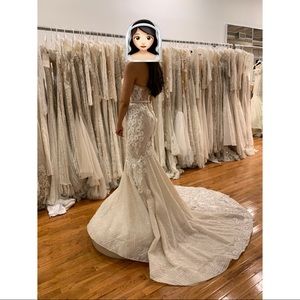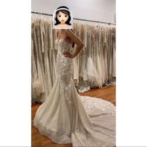 Berta 16-104 gorgeous strapless gown with 3 dimensional enbelishment, crystal handsewn detail throughout, exquisite berta figure-hugging fit. I bought it but changed my mind because I’m getting married on the beach and need something lighter, but this dress is a dream! Never been altered, it has 2 little stains on the lining that are no noticeable at all. Some of the flowers are falling but that’s an easy fix.