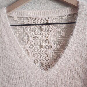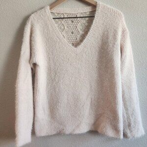 Berthie Paris Sweater Womens Medium Cream Fuzzy V Neck Lace Back Pullover Soft