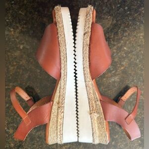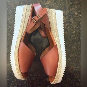 Bertuchi leather espadrille platform sandals, handmade in Spain. Cognac brown leather upper with ankle strap, jute platform, and rubber sole. Size EU 39 (fits US 8-8.5).