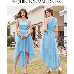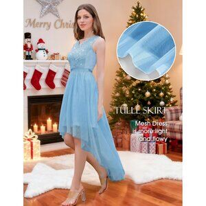 Wedding Guest Dress - It is a flattering midi dress perfect for a wedding that mainly convinces us with its romantic and gorgeous look. This hi low lace dress features satin belt, lace top, sleeveless design, sexy deep V back, simple color, which accentuate your perfect figure.
