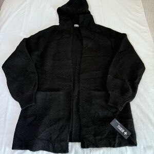 Black hooded open cardigan sweater in excellent condition. Has pockets. New with tags