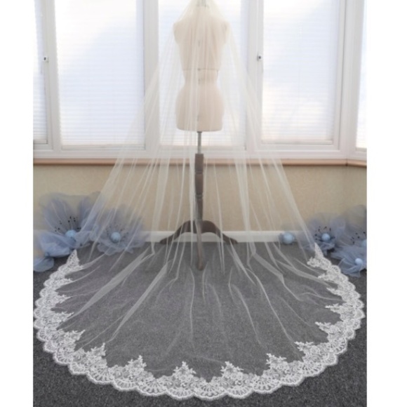 Hi! I'm selling my wedding veil! I had this custom-made from a vendor on Etsy. It's ivory tulle with ivory lace and it's exquisite! She's 112" long.