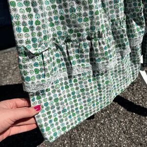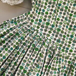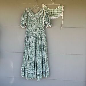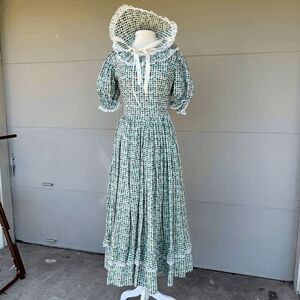 This one-of-a-kind prairie dress is a masterclass in craftsmanship — a piece that bridges vintage artistry with modern romantic style. Featuring a green and white floral leaf print, delicate lace trim, puff sleeves, and a flattering basque (V-shaped) waist, it’s completed by a full, densely pleated skirt and matching bonnet.