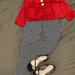 Heavily influenced by 1950s style, this modern, custom made red jacket with three-quarter sleeves has adorable details: two large glossy white buttons, gathers on the front and back yoke, and 3/4 sleeves. Crop length. Fully lined.