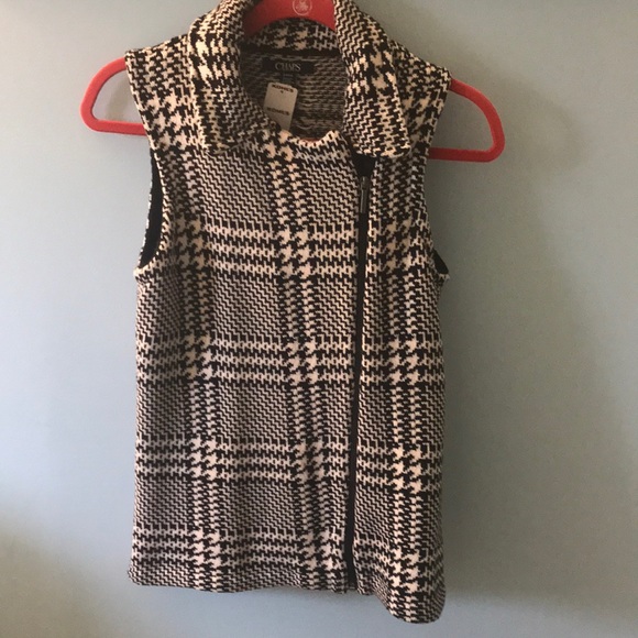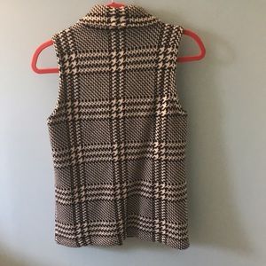 Knit vest with houndstooth stitched pattern. Asymmetrical zipper. Tried on but never worn. Cute with a tissue turtleneck or long sleeved shirt! Length hits below my hips (I’m 5’7”).