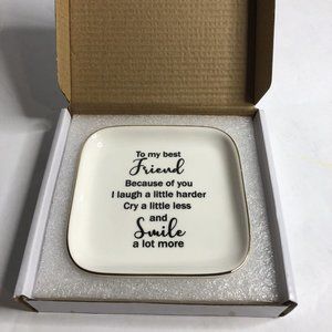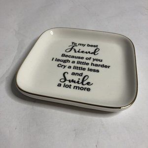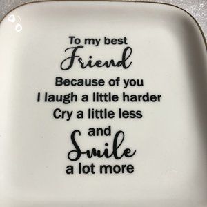 Best Friend Ceramic Ring Trinket Dish. “To my best friend, Because of You, I Laugh A Little Harder, Cry A Little Less and Smile a lot more.” See photos for overall condition and description of this item. Smoke free home.