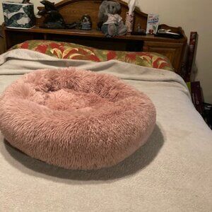 Best Friends by Sheri calming bed. This is the original calming bed for cats and dogs. It is a size medium (I think) and it is 30" x 30" x 9". This is machine washable. It is new and my cat never would lay on it. She has a calming bed which she loves and will not touch this one. It is kind of a mauve color.