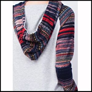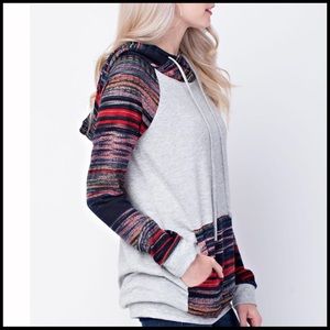 Best Hoodie Ever; heathered grey background with colorful knit sleeves. MEASUREMENTS (Measurements are approximate) Small: *bust- 17.” *shoulder- 14.5” *waist- 17” *length- 26” *sleeve length (approximate for all sizes)- 25” M: b- 18”, sh- 15”, w- 18”, L- 26.5” L: b- 19”, sh- 15.5”, w- 19”, L- 27” Material: 60% polyester , 35% rayon, 5% spandex @C4