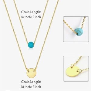 Bestelly layered Necklace. Made of 14K Gold plated brass, which is shiny and hypoallergenic. The 18 inch necklace has a coin, the 16 inch a faux turquoise bead. Lobster clasps to keep your necklaces secure. Wear layered or seperate. Comes in a beautiful box perfect for gift giving.
