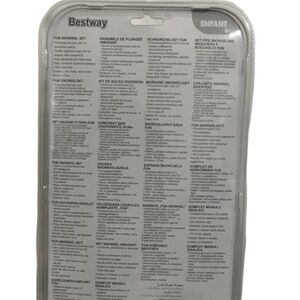 * Let your kids feel free to explore under water with this 2-piece snorkel set from Bestway! Bestway goggles and snorkel 2-piece set Includes dive mask and snorkel tube Dive mask with polycarbonate lens with UV protective coating Double feathered edge skirt on mask for leak-resistant fit; fully adjustable split head strap Soft, comfort-fit snorkel mouthpiece 100% latex free Ages 3 years+