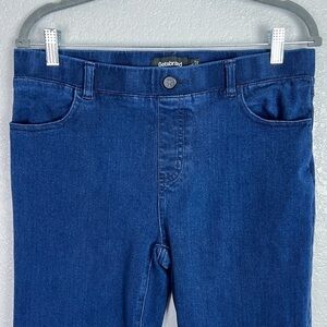 These Betabrand yoga denim jeans offer a boot-cut silhouette in a dark indigo wash, combining the comfort of leggings with the look of classic denim. Featuring a mid-rise fit with a wide elastic waistband, four pockets, belt loops, and a non-functional button and fly. Made from a stretchy cotton-blend fabric, size Large.