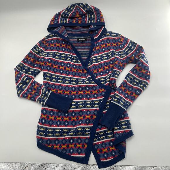 Betabrand Fair Isle Merino Wool Blend Mission Wrap Hooded Cardigan Blue Red