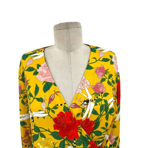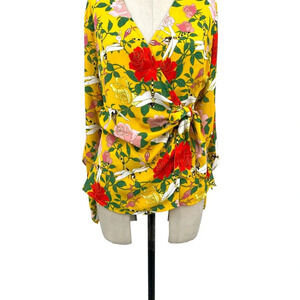 Yellow with allover floral and dragonfly print. Wrap style with inside button closure and tie. Bell sleeves.