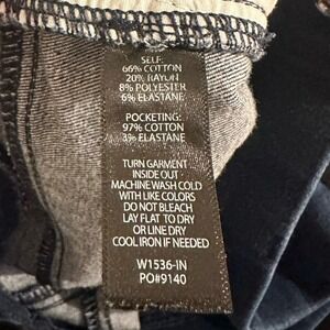 Turn inside out, then machine-wash cold with like colors (non-chlorine bleach only) and lay flat to dry. Use a cool iron, if needed. 66% cotton, 20% rayon, 8% poly, 6% spandex.