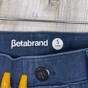 Betabrand pull-on slim jeans in women's size small (4–6). Blue stretch denim with a comfortable fit and zip-hem detail. Made in USA. Designed for effortless everyday wear, travel comfort, or casual office style.