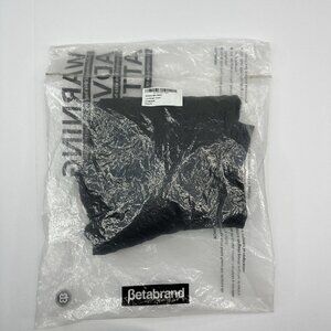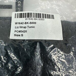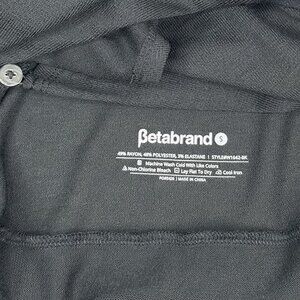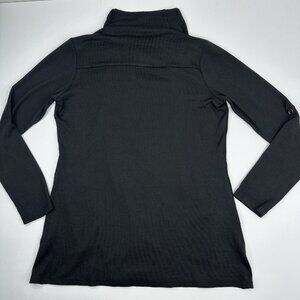 Betrabrand women’s size small sweater, it is The Liz Tunic style, color is black, convertible long roll tab sleeves, can be worn open or closed, lightweight summer spring fabric, long length, stretchy, cowl neckline, wrap design with button on shoulders, slightly oversized, soft and perfect for a Time Capsule wardrobe. Materials 49% rayon, 48% polyester, 3% elastane. Care machine wash cold, lay flat to dry. Condition is new in original packaging as shown in pictures. Please preview the measurements to ensure fit.