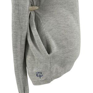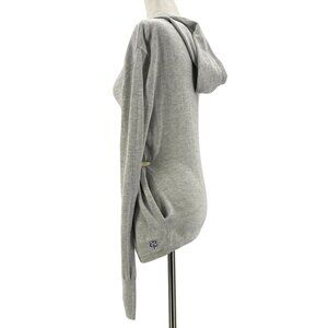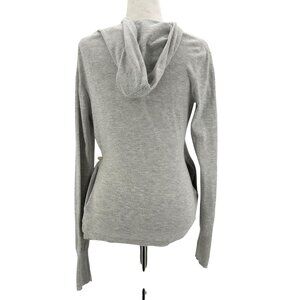 Betabrand Womens XS/S Hoodie Wrap Cardigan Sweater Knit Heather Gray - Women's XS/S - X-Small/ Small - Lightweight long sleeve hooded knit wrap cardigan sweater - shade of Heather gray. Has 1 outer hook button & 1 inner button. Thumb holes on the cuffs. 2 side pockets. 63% Cotton, 25% Polyester, 7% Nylon & 5% Silk.