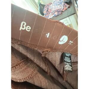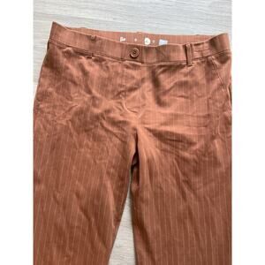 Betabrand size large petite brown pinstripe pull on pants. They are in excellent condition. The vinyl tag on the inside waistband has mostly peeled off but other than that they are excellent with no signs of wear. Waist is 16 1/2” across. Inseam is 32”.