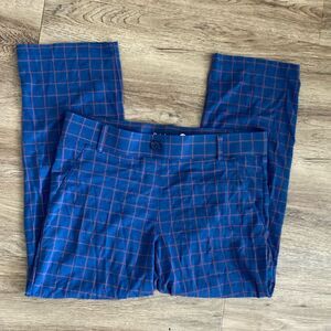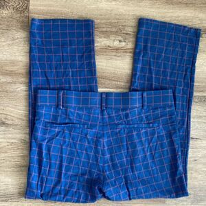 Comfortable blue plaid pattern. Faux pockets, Ideal for work wear. 17 in elastic waist, 10.5 Rise, 26 in inseam, in good conditions