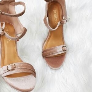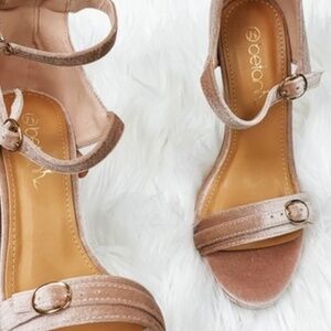 Gorgeous Betan Betan Danica Pink Velvet Heels Blue Velvet Heels, sexy heels with gold buckle accents on the top and all 3 straps total.