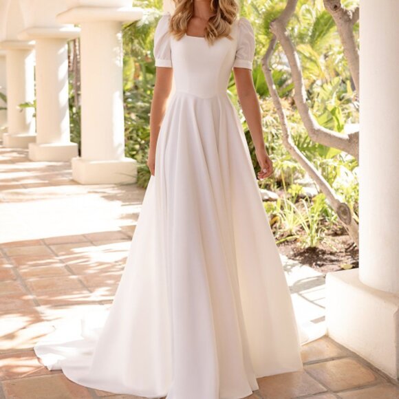 A timeless blend of elegance and simplicity, this gown is designed for the bride who loves clean lines, romantic details, and effortless grace.Featuring a classic square neckline that beautifully frames the collarbone, this dress brings a modern twist to traditional bridal style. Soft puff sleeves add a touch of romance while keeping the look modest and refined.The smooth, structured bodice flows into a full A-line skirt that drapes seamlessly into a sweeping train, creating movement and subtle drama with every step. Delicate buttons trail down the back, adding a refined, feminine finish. And as a bonus—this gown has pockets, making it both stunning and practical for your big day.Perfect for the bride who wants a timeless, modest, and sophisticated look that feels both fresh and effortlessly beautiful.