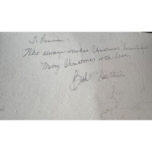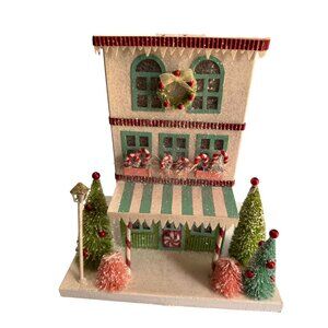 This charming handcrafted Christmas house by Bethany Lowe adds a festive touch to your holiday decor. Detailed with candy canes, wreaths, and miniature trees, its design embodies the spirit of Christmas. Measuring 12" x 11" x 8", it is an ideal centerpiece for your seasonal display. This was gift she gave her friend, (also one of her designers) - see signature on back. There is an opening in the back if you want to make it a lighted house.