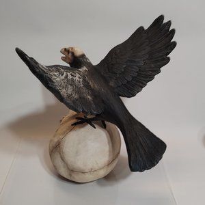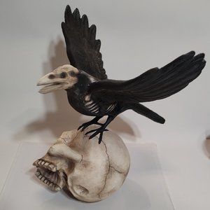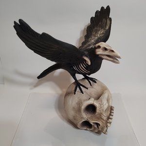 Bethany Lowe Designs Haunted Raven on Skull is made of resin and measures approximately 11 1/2 inches by 7 1/2 inches.