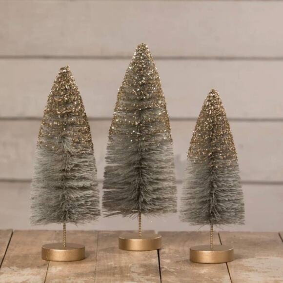 New Bethany Lowe set of 3 Midnight Shine Bottle Brush Trees. Silver and shimmery, these bottle brush trees are a cool metallic shade of soft grey with a dusting of silver moon dust glitter on top.