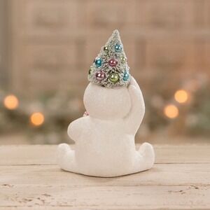 New Bethany Lowe retro inspired Pastel Candy Cane Snowman With Tree. This adorably, chubby, pastel snowman has a colorful bottle brush tree on his head and candy cane in hand.