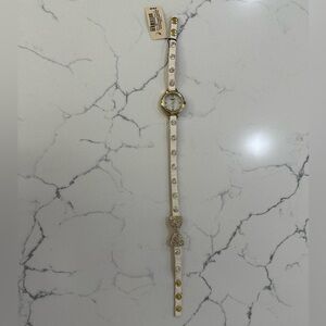 This elegant women's watch set features a stunning cream band with gold accents. Great add on to any outfit to make it trendy. Never used. Watch battery is dead.