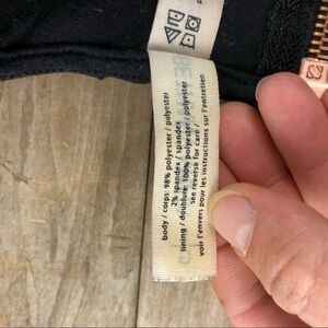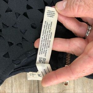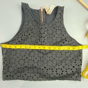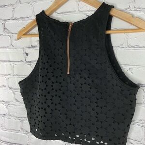 Black cropped sleeveless laser cut top has rose gold zipper in the back and black lining. Excellent pre-owned condition, no flaws. Women's size large.