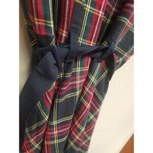 Classic red plaid pattern tartan dress with button down style top and flowy a-line skirt. Shirt collar style with buckle belt.