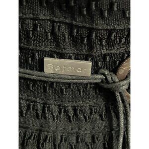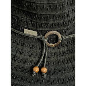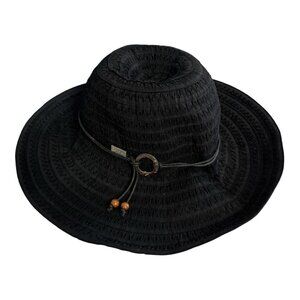 Chic and lightweight sun hat by Betmar New York, crafted from woven black polyester for breathable comfort. Features a decorative cord band with a textured ring accent and two wooden beads for a subtle boho touch. Ideal for travel, outdoor events, or casual wear during sunny days.