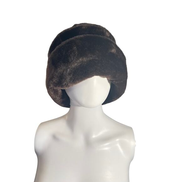 No material tag present, but feels like a plush/faux fur or fuzzy wool blend. Stylish and versatile, pairs beautifully with coats, sweaters, and scarves for a polished seasonal look.