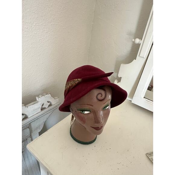 Keywords: burgundy hat, pheasant feather hat, fall accessories, winter wool hat, art deco fashion, 20s style hat, Gatsby hat, retro cloche, vintage Betmar, women’s wool hat