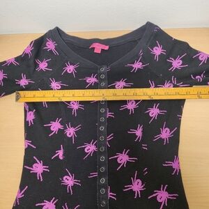 This Betsey Johnson dress from the 2000s is a real vintage gem for those who love unique and quirky fashion. The dress features a whimsical spider print and a round neckline, perfect for a casual or party/cocktail occasion. The knee-length dress has a fit and flare style and long sleeves with a snap button closure, making it easy to wear and comfortable.