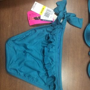 It's super beautiful! Wish it for me but unfortunately too big. It's a size medium and the tags are on the bottoms yet. Took tags off top byaccident when I got it. Bottoms were originally 76$ and top was the same but no tags on the top. It's a gorgeous turquoise and it's sad seeing it go.