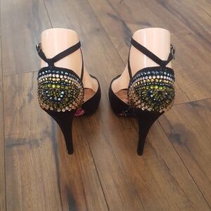 Excellent used condition.Betsey Johnson - 90's Black & Rhinestone Heels. Peep toe. Ankle Multi strap. Multi-color rhinestone embellishment. Stiletto heel Black Microsuede fabric upper. Manmade. 1 inch platform. 5 inch heel height.