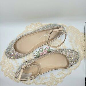 If sparkle and shine is your thing, then these beautiful Betsey Johnson flats are just what you are looking for! They are very reflective but are not white, they are more of gold base and the rhinestones are securely fastened in place. They feature a flat heel and a ribbed area under the ball of the foot for safer walking. Not supportive but the ankle strap provides ease of walking. In the sun, they reflect a pretty rainbow appearance. Perfect to wear to a wedding, in a wedding, in a wedding party, rehearsal party, cocktail party, dinner party, the list is endless. My sister could not wear heels to her son's wedding so she had purchased a pair of these and they were the perfect solution for her needs! This pair was worn once and there is no damage or wear other than minor scuffing on sole. They have been lovingly stored in their original Betsey Johnson box.