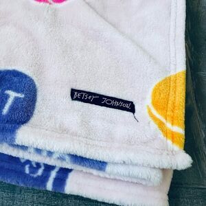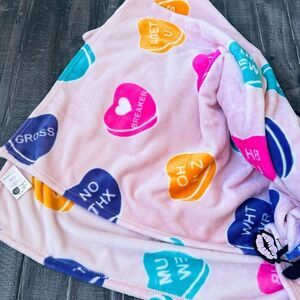 NWT Betsey Johnson ultra soft plush throw blanket with multicolor message hearts with funny snarky messages on light pink background, Very soft and cozy. 50”x70”