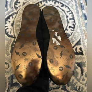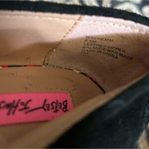 These Betsey Johnson Mayhemm moccasin flats feature a vibrant beaded design on a black suede-like base. The classic loafer silhouette with a rounded toe offers a stylish and unique look, perfect for adding a bohemian touch to any outfit. Great condition.