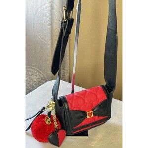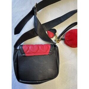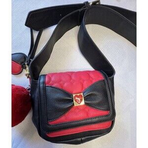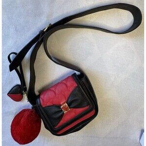Betsey Johnson Big Bow shoulder bag with a Pom Pom fob, an enamel heart fob with a key hole, a red and black leather heart fob, and black leather fob. There is a scratch on the front hog the hardware on the purse (see the pic) otherwise, the purse does not show any wear.
