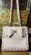 This bag is in very good used condition, looks almost new without tags. Exterior has a tiny faint spot. Interior fabric is extremely clean with 2 desiccant pack found in a pocket. Name plate at center of big bow is shiny but has a few scratches. The handle has a lost a couple stitches on one side but is stable. Nice adjustable and detachable strap to convert the piece from handheld to shoulder or crossbody. Nice size with two large side compartments, one with 2 drop pockets and one with the zip pocket containing the packets. Bag looks minimally used. There is a handle tab still retaining the original protective plastic wrap. Bag body measures approximately 12.5”x11”x4.5”. Strap is about 46” and is adjustable shorter. Small pink spot on one edge of long strap.