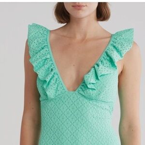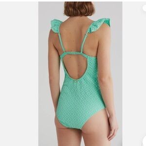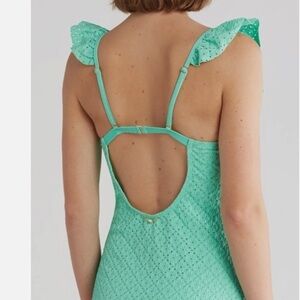 Betsey Johnson Biscay Green 1 piece Ruffle strap eyelet Swimsuit size small new