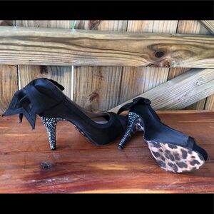 Stunning Show Stopping Black Fabric CASEY Y-R Pumps by Betsey Johnson. Oversized Black Bow Sits At The Top of Each Crystal Encrusted Heel, Leopard Fabric Insole & Leopard Fabric Sole. Gold Tone Metal Heart Betsey Johnson Logo on the Bottom of Each Shoe.