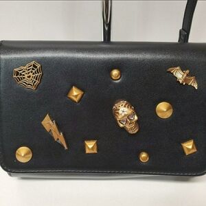 Chic black crossbody bag with unique gold embellishments. Features playful designs for a bold look.